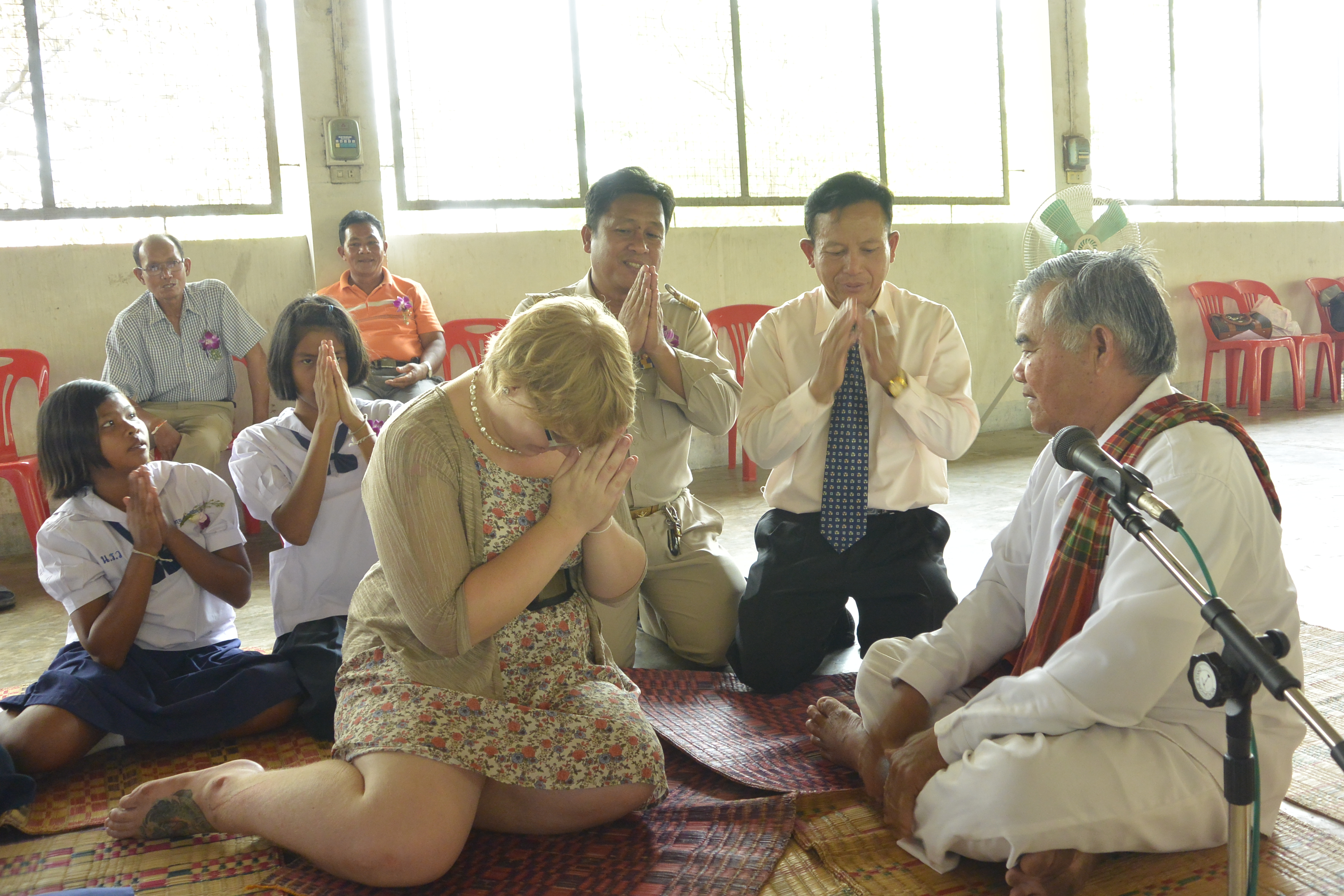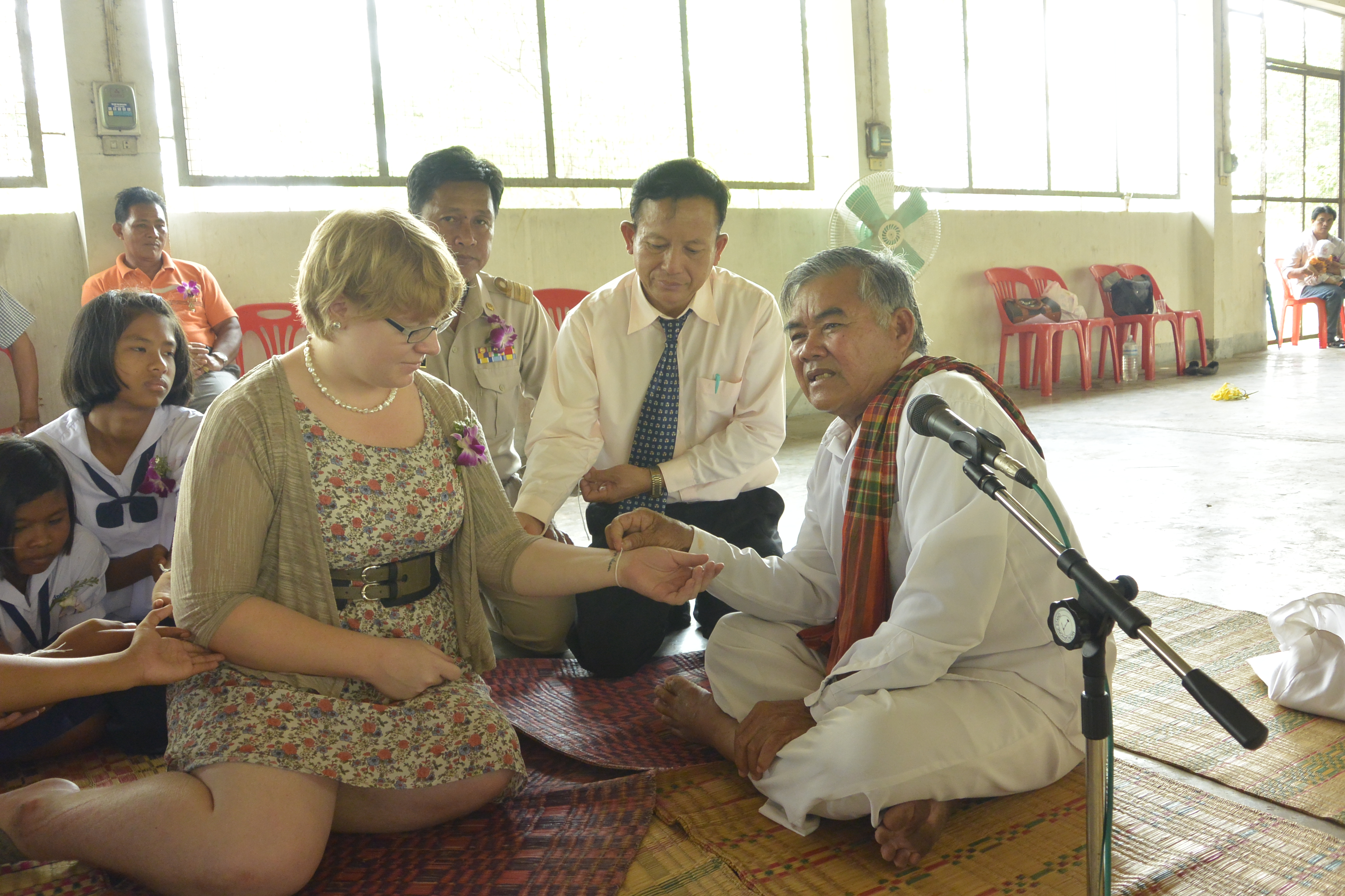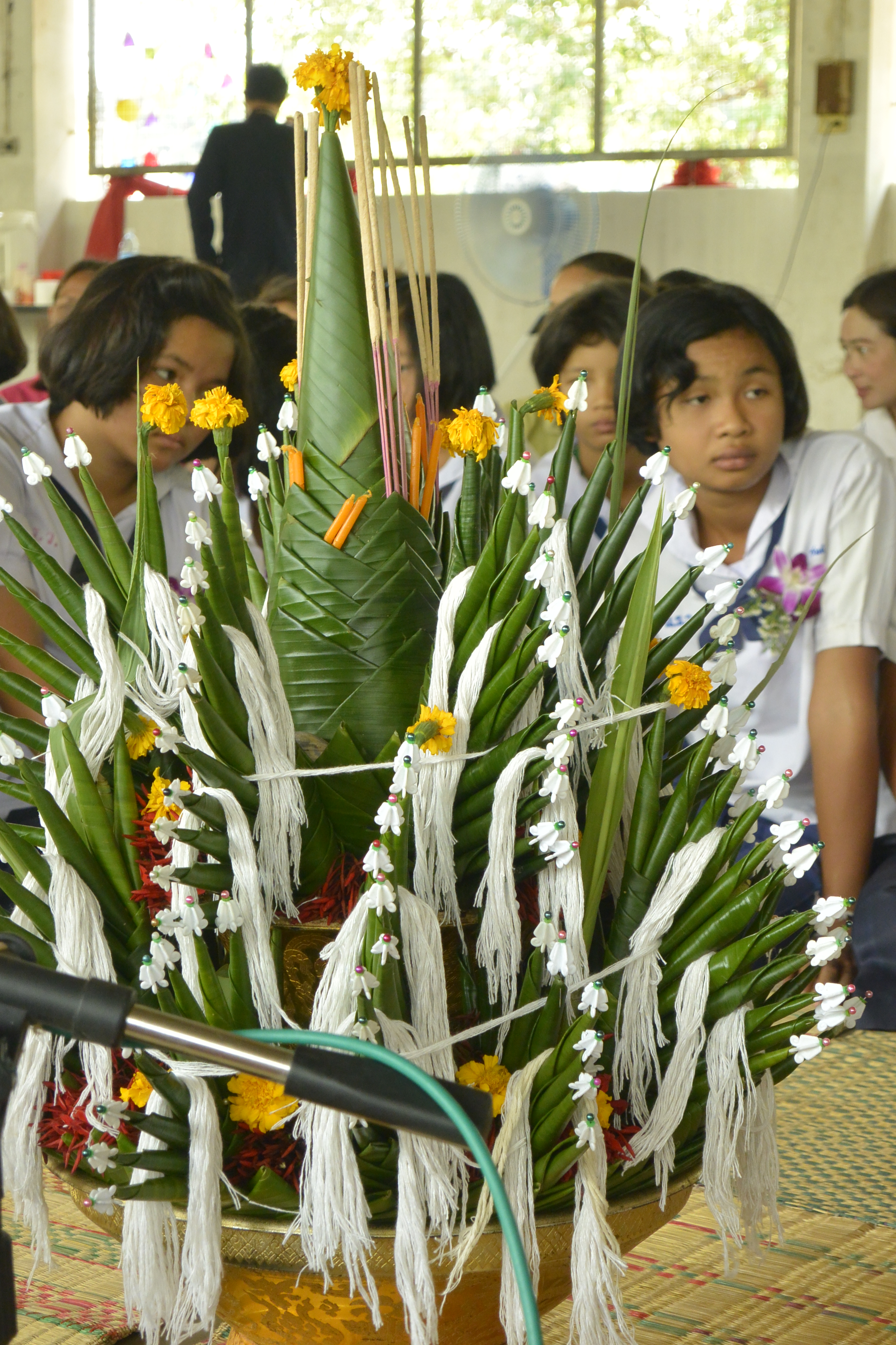 There was a kind of sculpted offering placed in the middle that has lots of precut white strings. The religious man (he wasn’t a monk, but I don’t know what the title is) passed a string around the inner part of the circle and everyone pressed their palms together and lowered their heads as he chanted. Then he took one of the precut strings and tied it around the wrists of one of the students and said a blessing while everyone touched each other forming a web of connection to the student. After that, he did the same for me. After that, all the adults in the room tied strings around the wrists of the students and me. I also tied some strings around the students’ wrists.