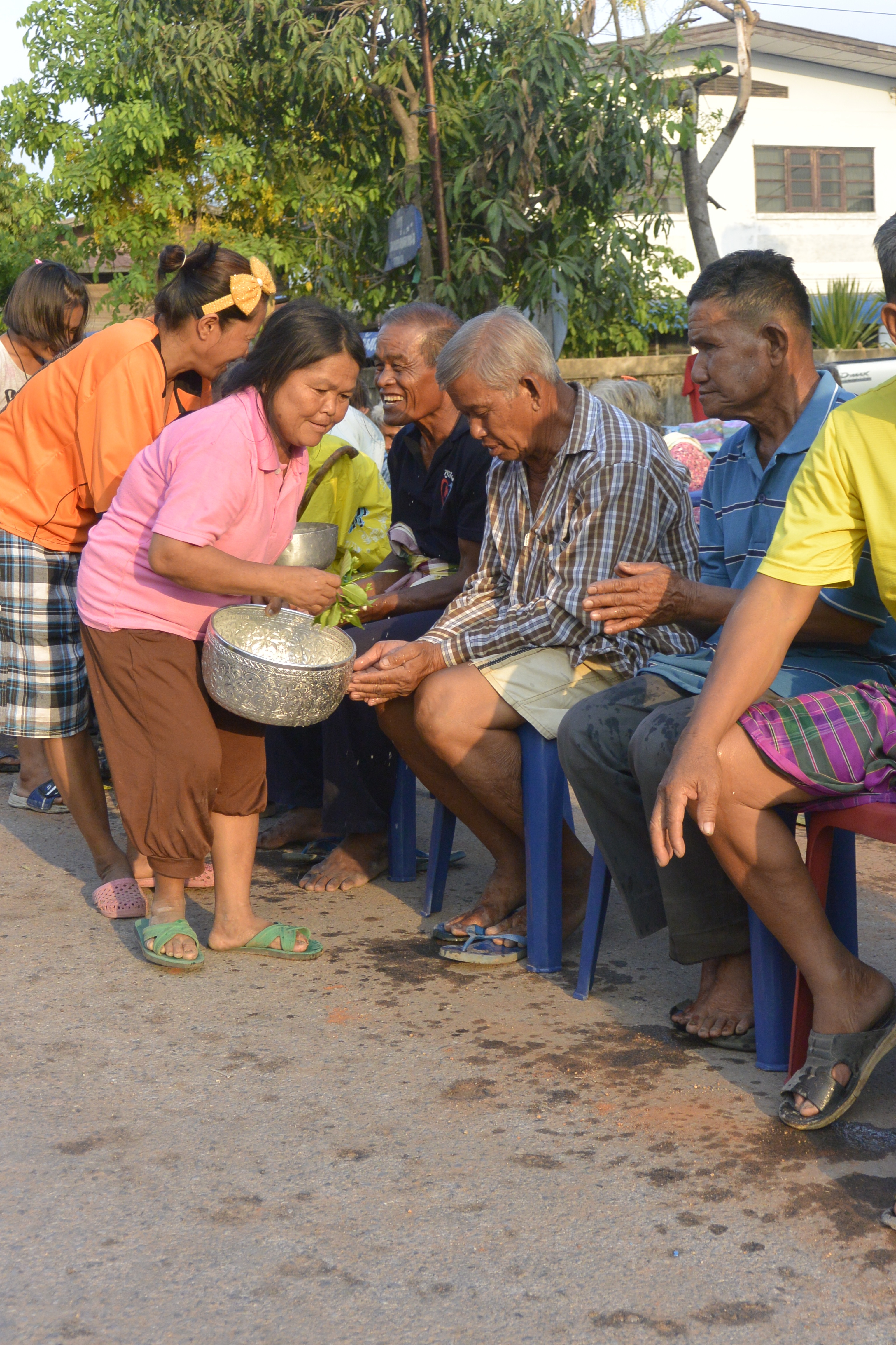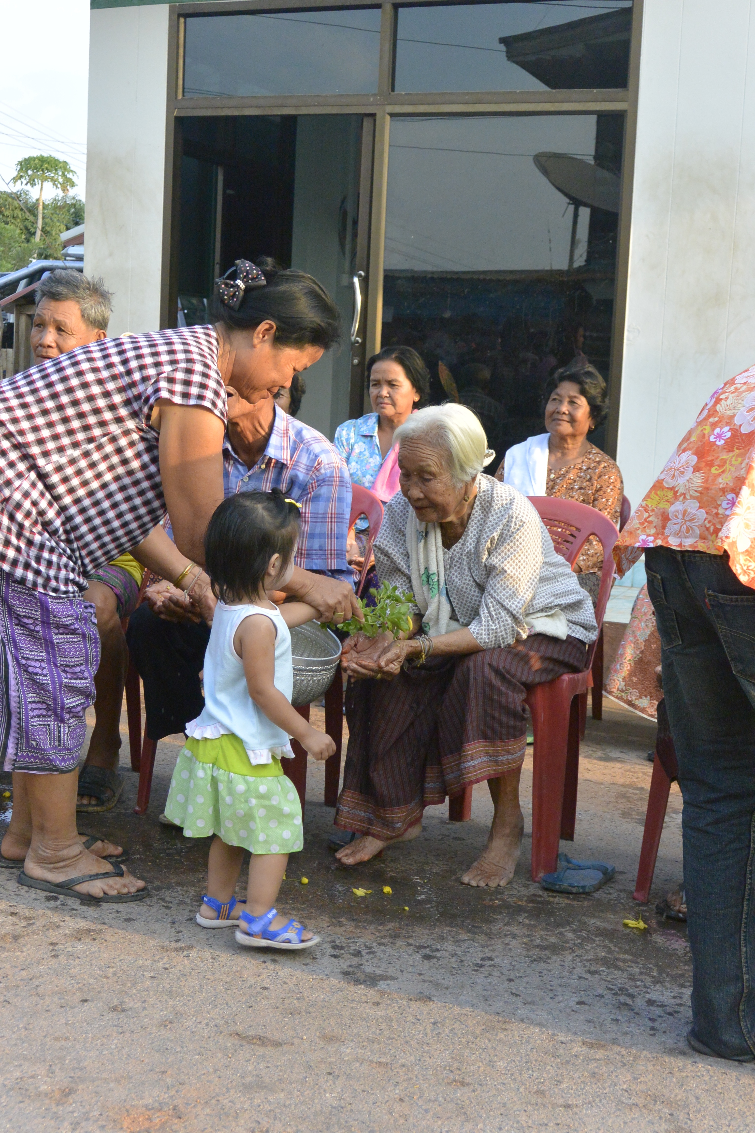 Later, the villagers paraded the Buddha statue through town for everyone to sprinkle water on and then join in another dance party as we made our way to this pavilion with some Buddha statues there. A bunch of monks and nuns were there as well. There was more sprinkling of water on the Buddhas and chanting and then more sprinkling water on the monks’ and nuns’ hands. Afterwards, my host mom and I hurried home because Mother Nature decided that it was her turn to play with water. We made it home just before the rain started, which was a nice way to end Songkran.