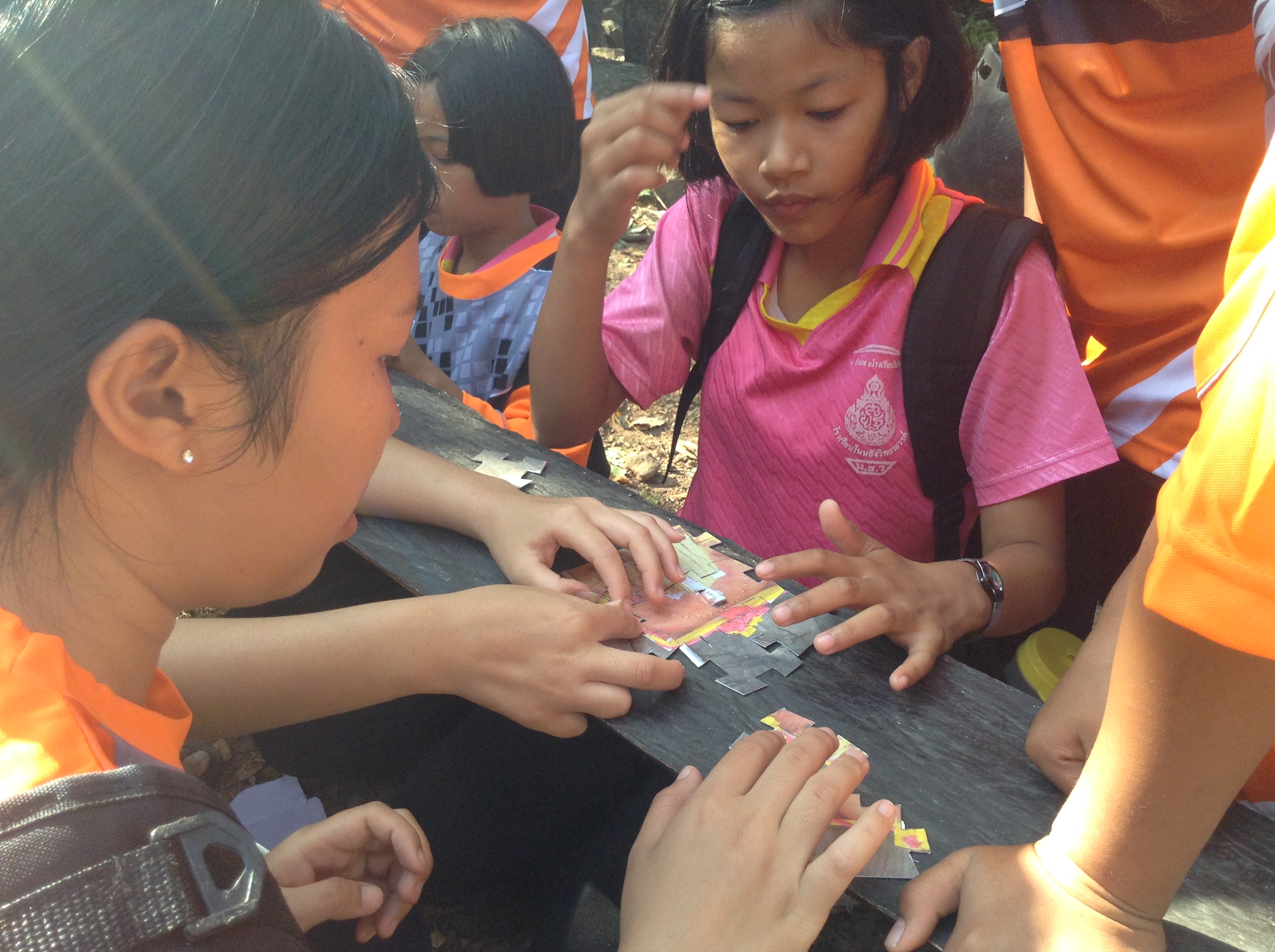 The catch was that all of the eight individual puzzles came together to make one single image, so when each of the eight groups were done with the pieces they had found on their own and we told them that they weren’t finished yet, and to listen carefully to the directions it inspired some of those critical thinking skills that most Thai students don’t get to practice very often. The students were able to figure out the meaning of the directions and a quick debrief of the activity discussed with the students the idea that we are all each other’s team and that you don’t always realize who could be a potential teammate.