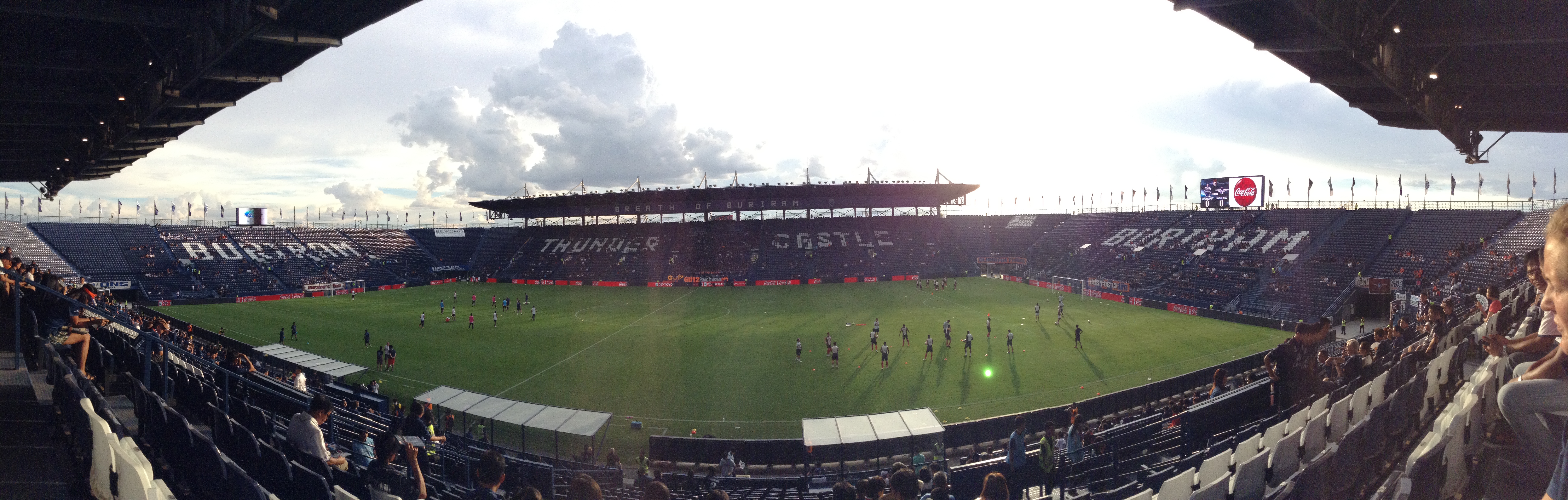 Buriram United is one of the top teams in the country, often playing international matches. They beat Bangkok United at home in the Thunder Castle, 3-0. My friend Janet likes to put “professional” in quotes when describing the Thai teams, as she played in college and has a lot of years as a football fan, so she knows her stuff. It was still an exciting match to watch, if nothing else than to take in the natural environment of Thai enjoying soccer and a well loved and known team. I think my favorite part was watching the hardcore fan section across the way, as they banged drums and sang songs throughout the match and unfurled banners upon each goal scored.