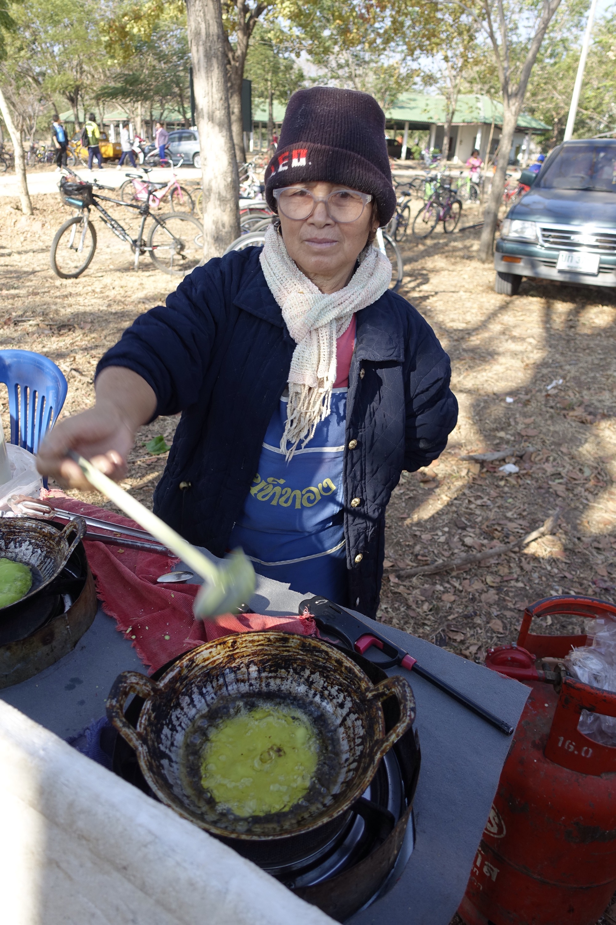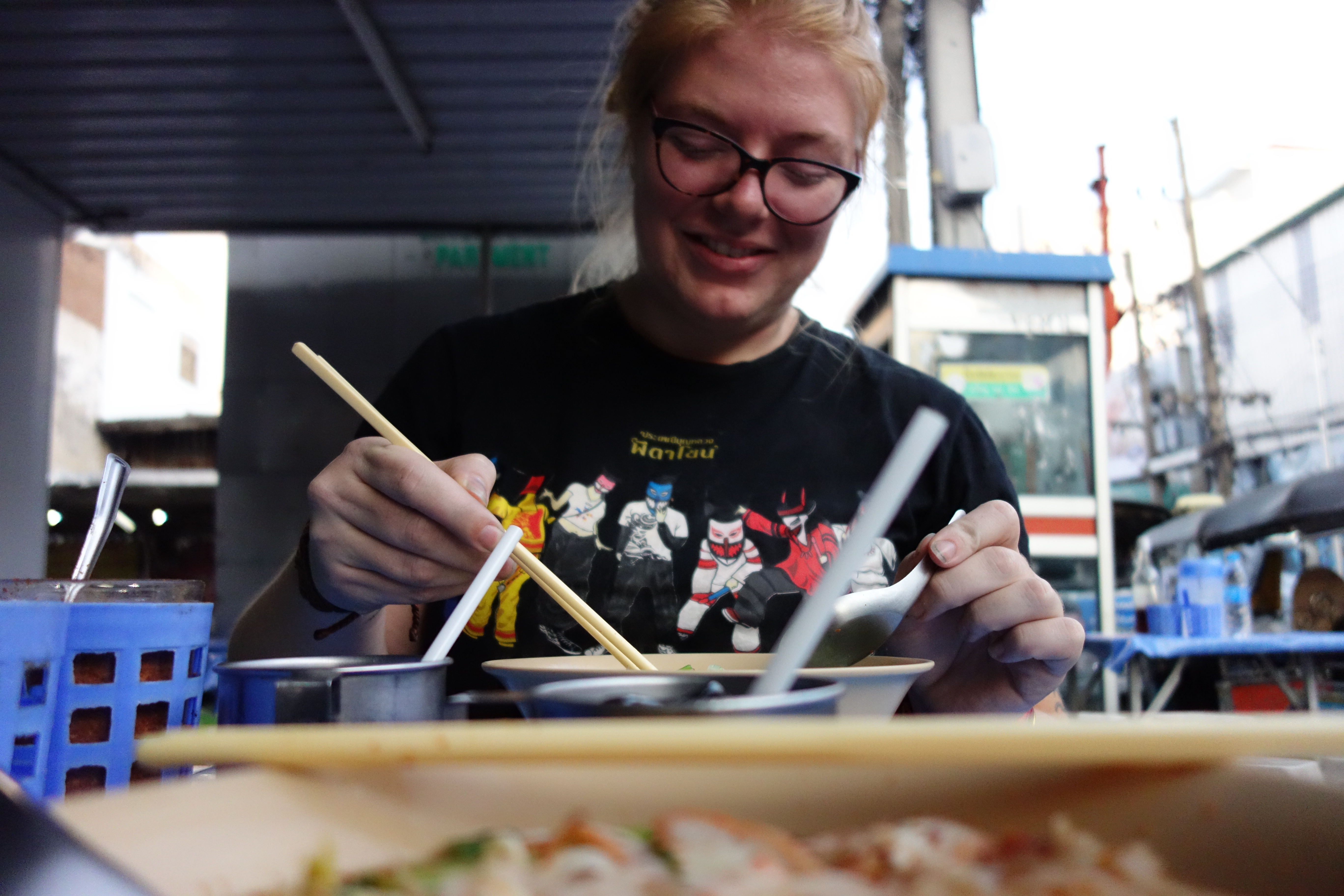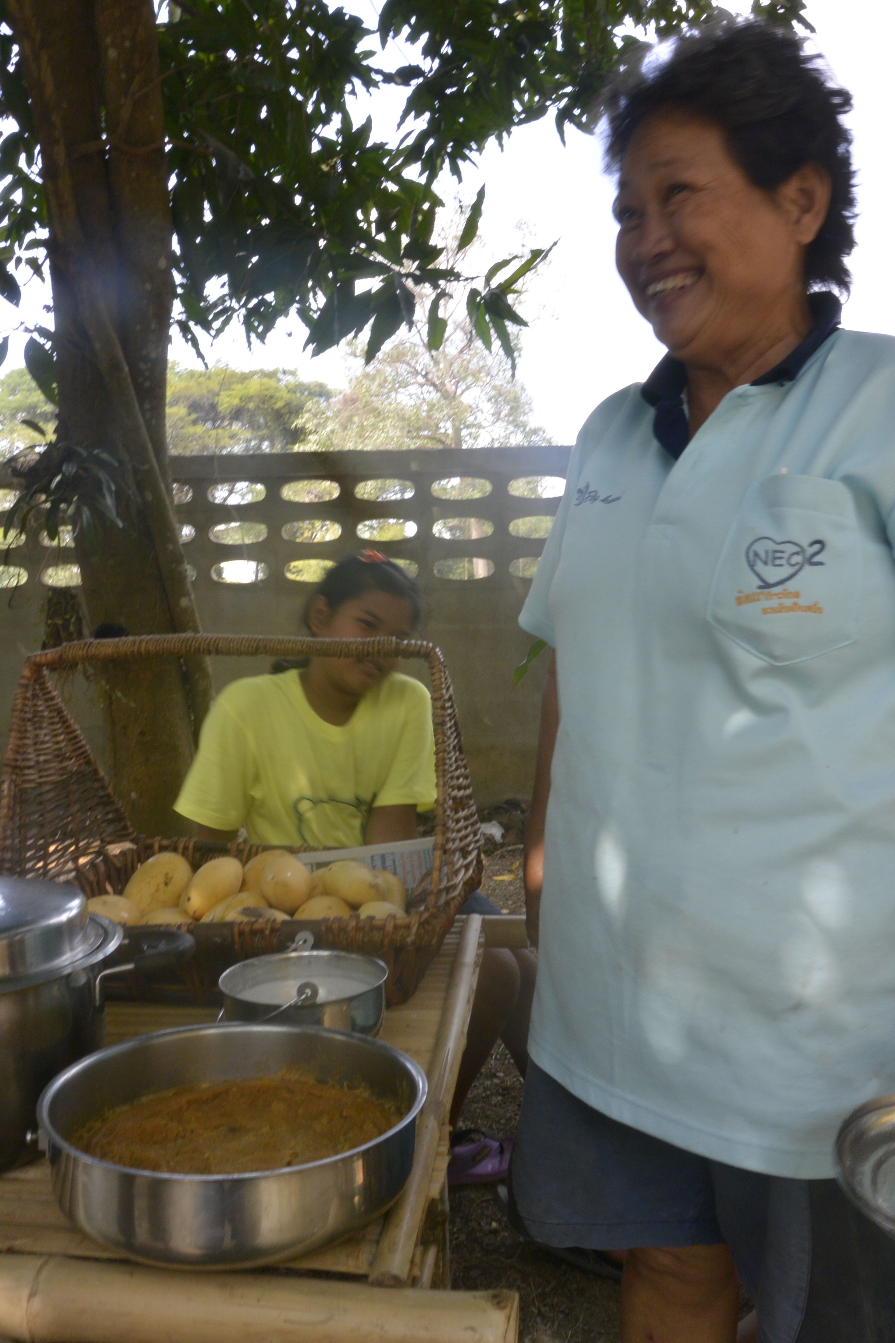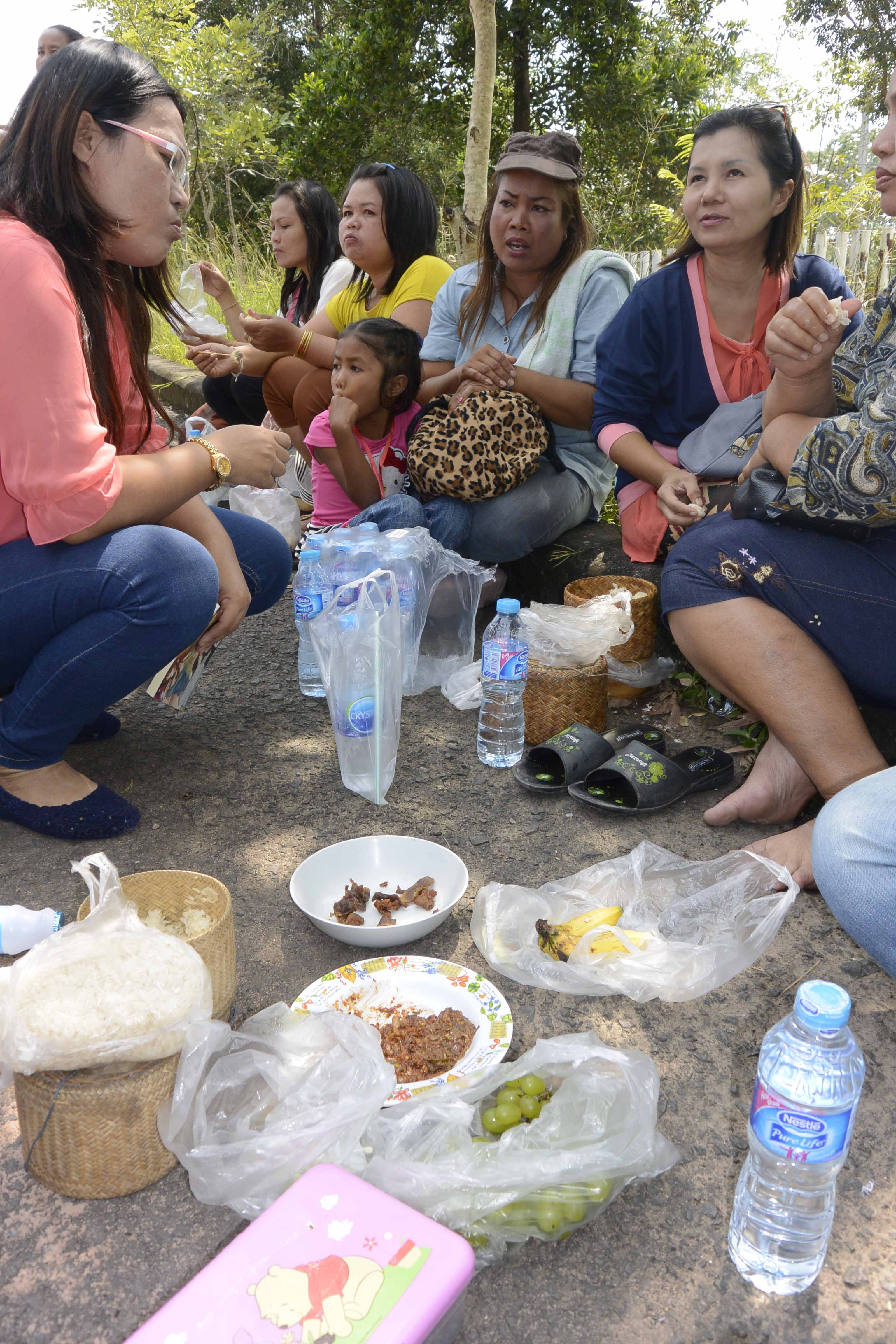 Eating sticky rice and nam prik in the parking lot.