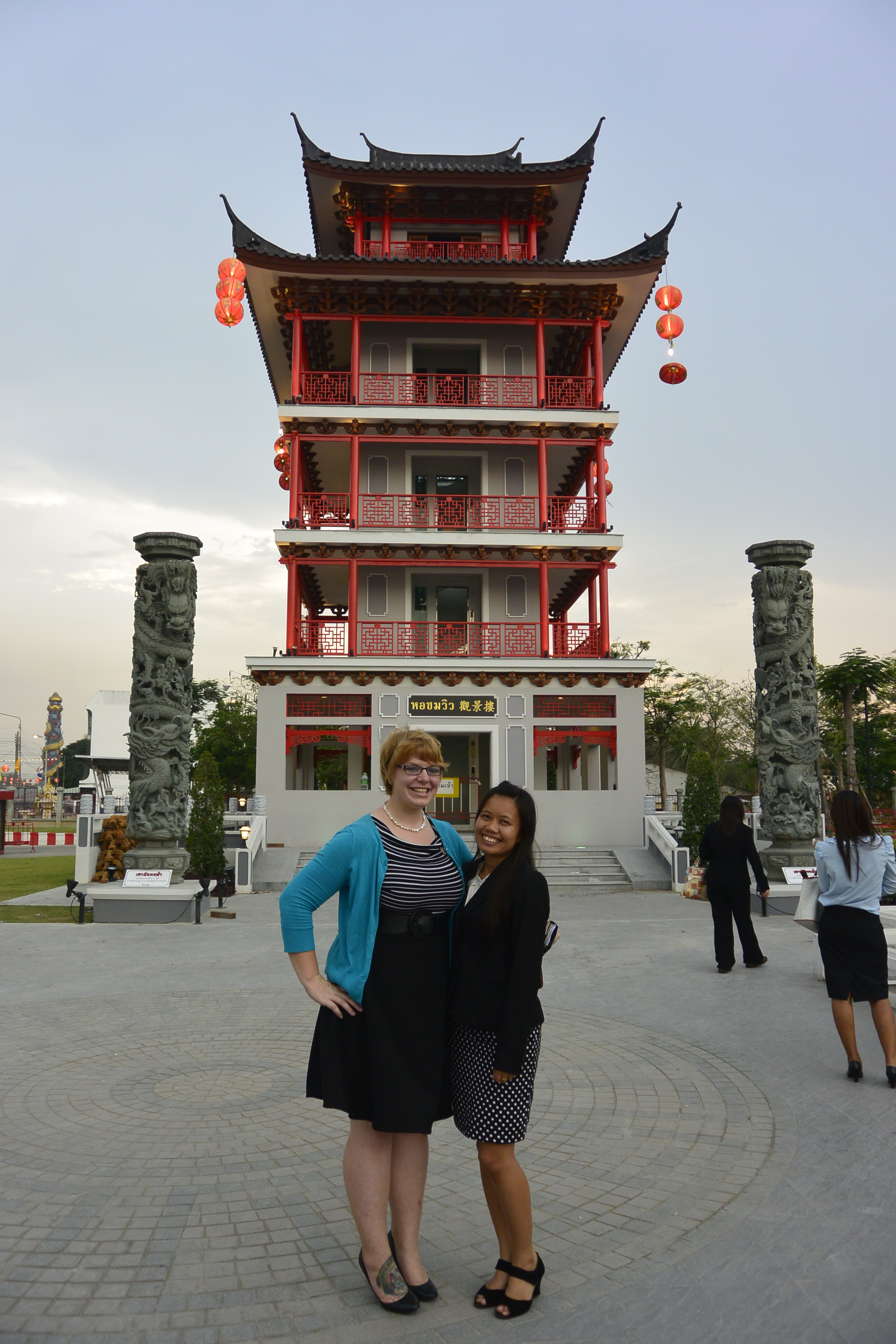 My co-teacher and I, in front of a replica statue of Ya Mo in my district.
