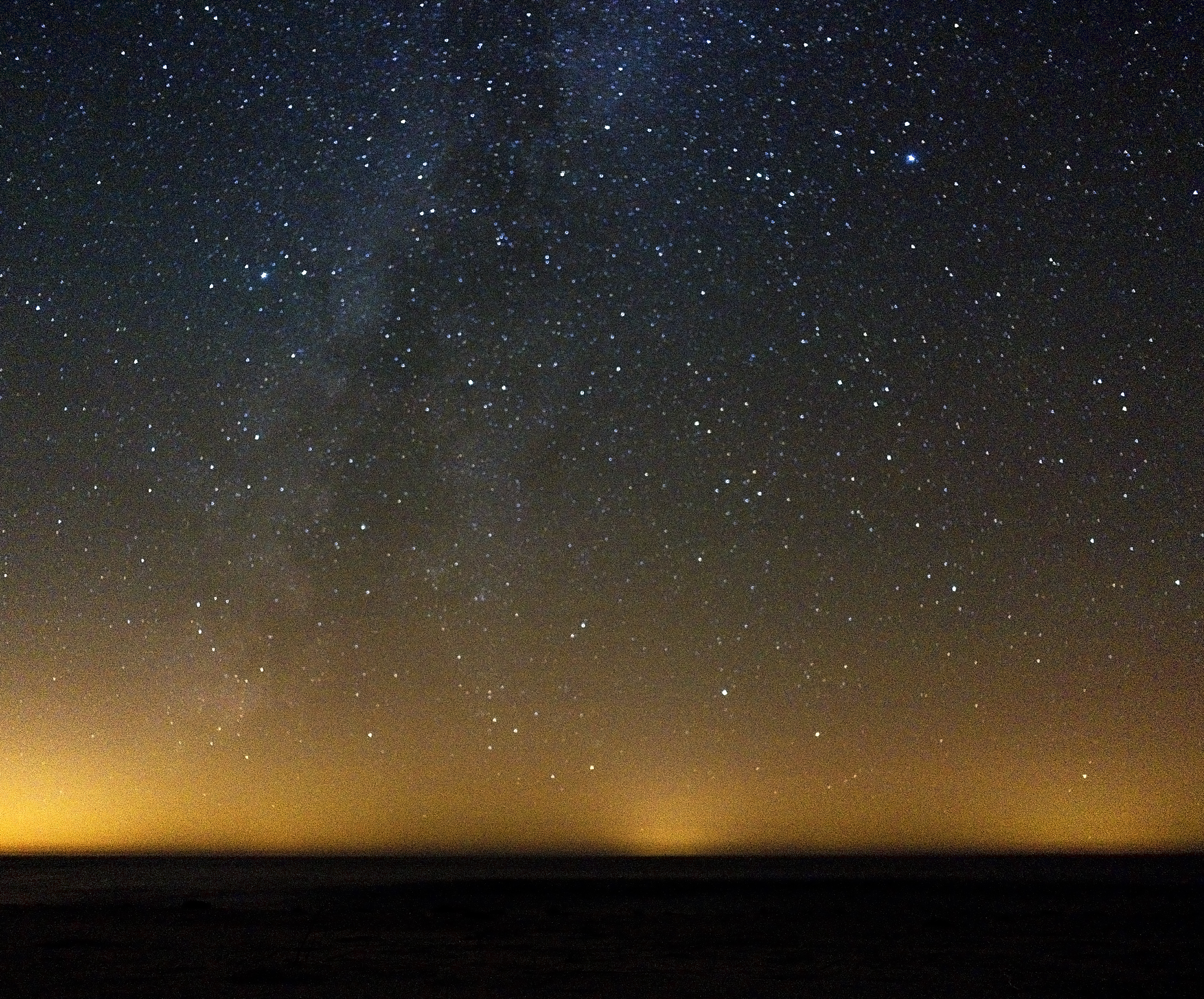 Around 10 p.m. I noticed that there was a pillar of faint light coming up off the horizon over the lake, and that there was a light fog all along the horizon. We both aimed our cameras, clicked the shutter and sure enough, the tell-tale green of the aurora borealis was there. I was so giddy as I began to notice the faint pillars appear and move across the horizon and then seeing what my camera captured.