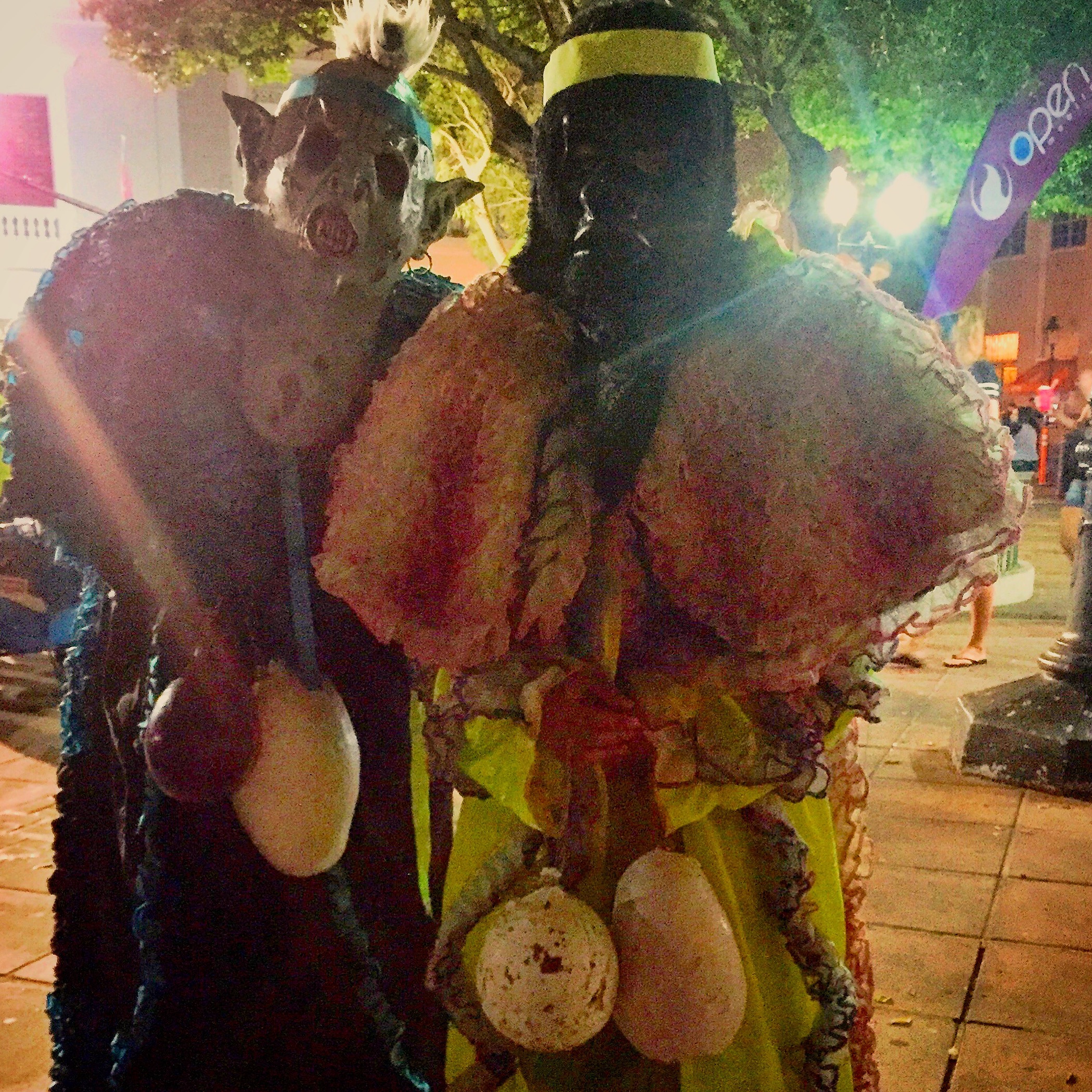 They have since evolved in the depictions of demons, meant to scare people back to church and have incorporated the African and Taíno influences. Their costumes include masks and lots of fabric around the back and arms that is meant to simulate wings, similar to a bat. They carry around what were traditionally inflated animal bladders, but according to one vejigante are papier-mâché now, which are used to playfully bop attendees of the celebration.