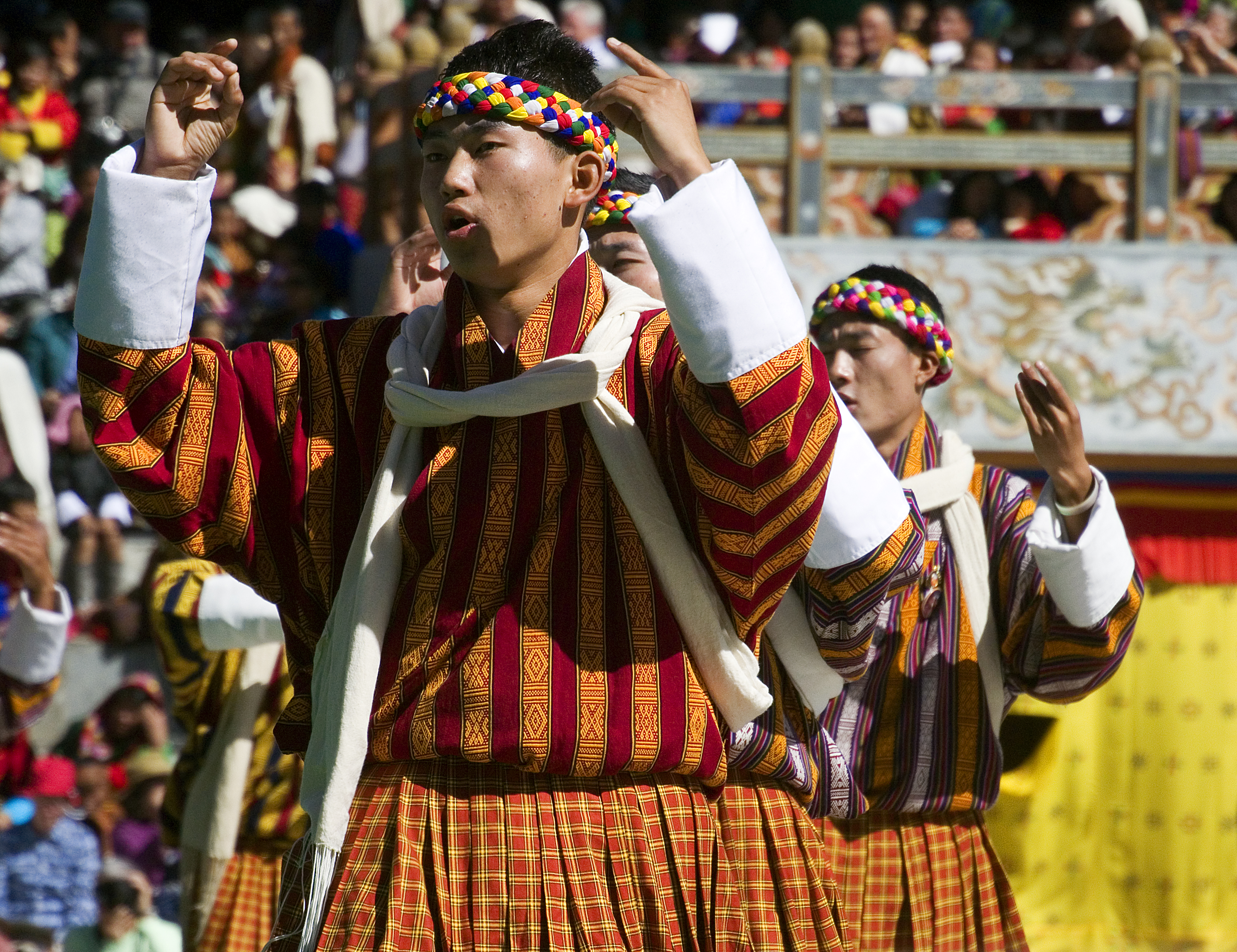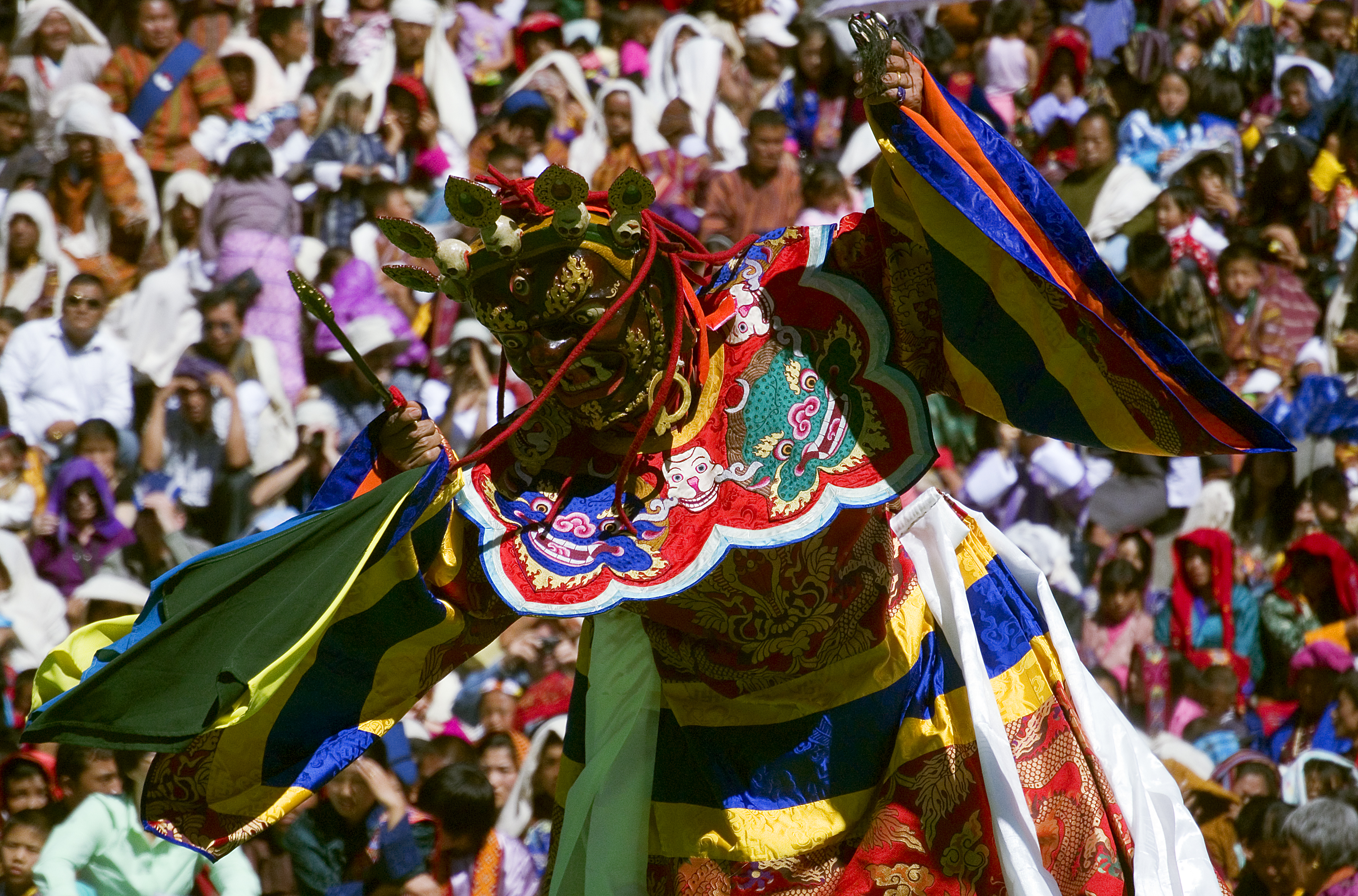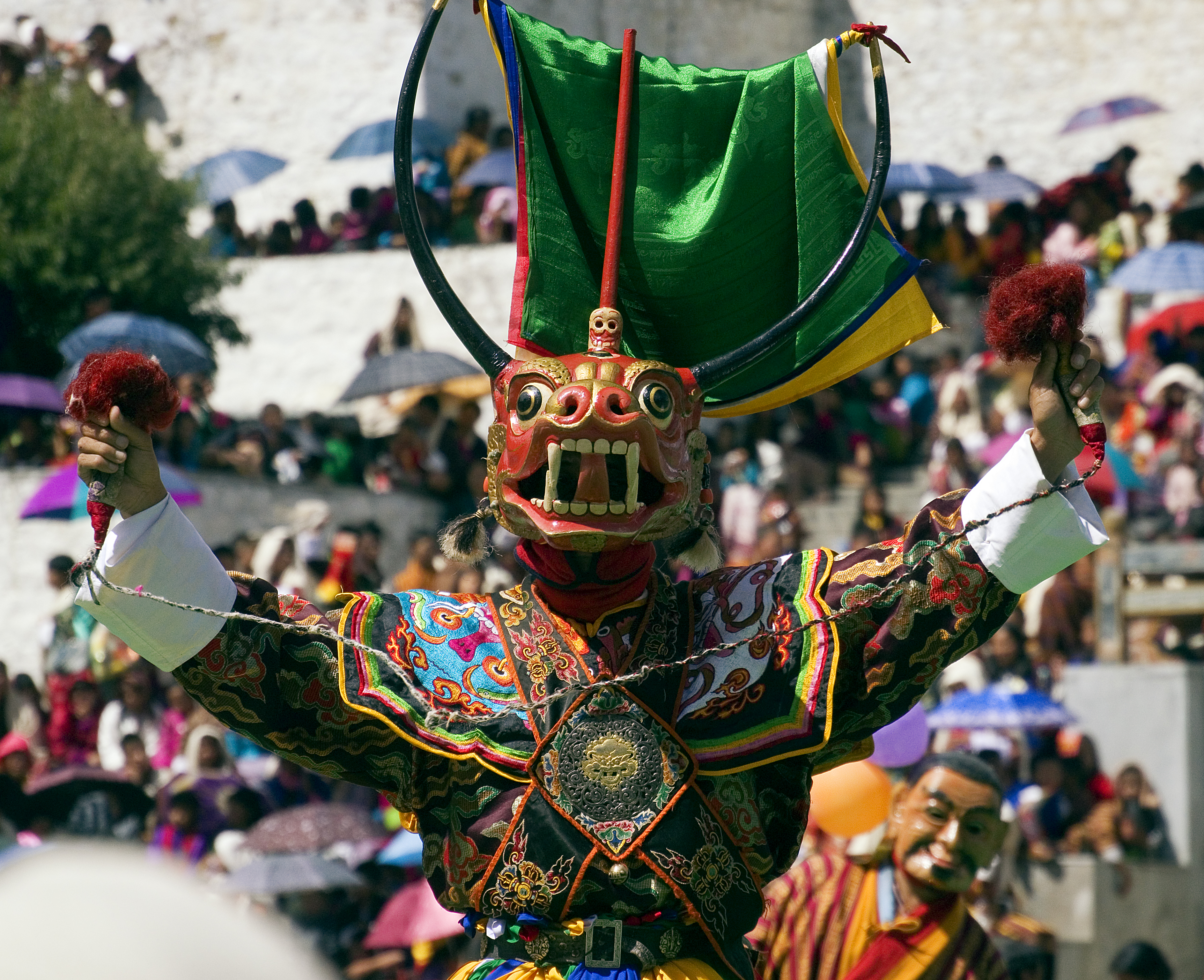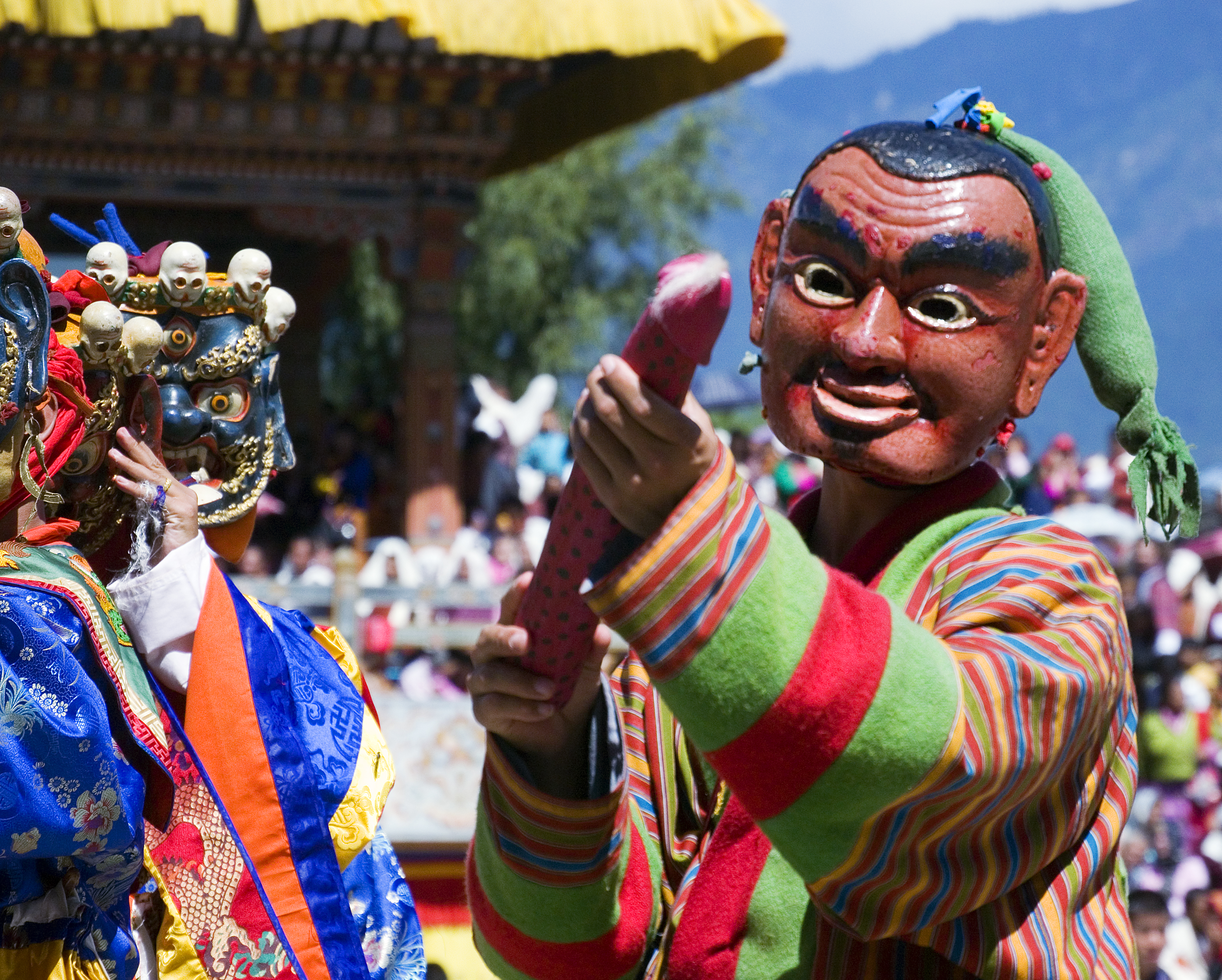Over four days, the dances are performed at the local dzong, a fortress and often a religious house. There is a set schedule for the dances that happen each year. Some of the dances are performed by monks who go into full meditation for the duration of the dances, some of them lasting more than an hour. There are also clowns who roam throughout the crowds, lightening the mood especially in the interludes between the dances. On the morning of the fourth day, the thongdrel, a sacred tapestry is unfurled in the predawn hours and then stowed away again for the year by the time the sun rises.