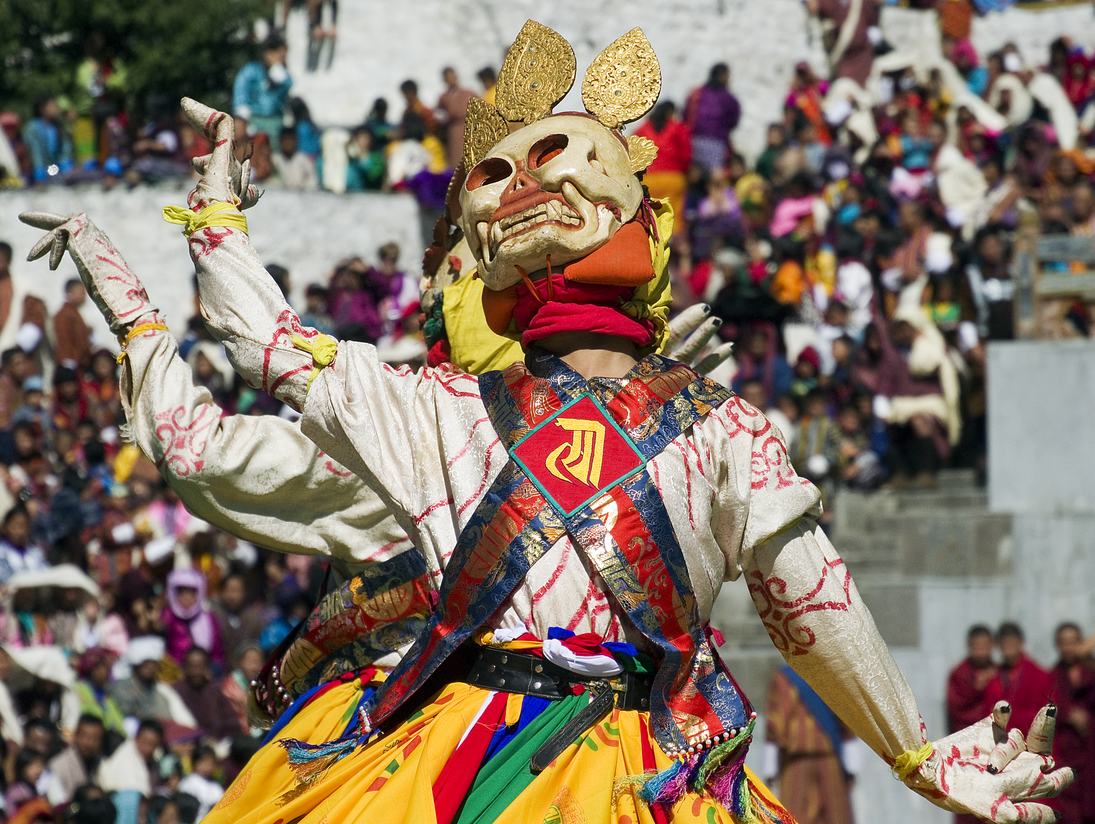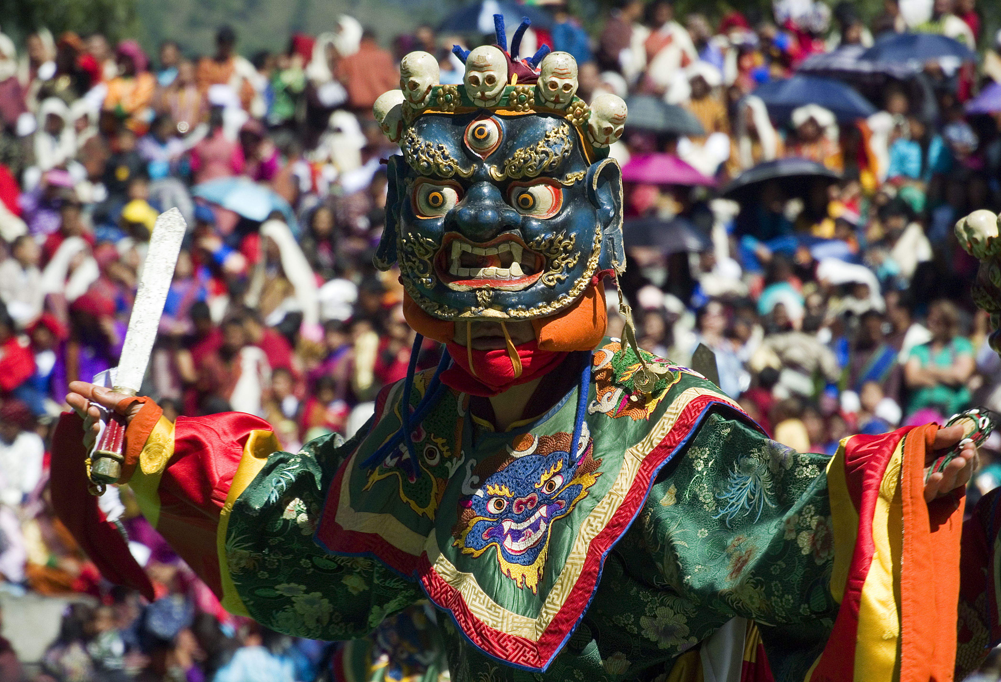 Tshechus are celebrated in Bhutan, Tibet and parts of northern India. Held annually on the tenth day of a Tibetan lunar month, these religious festivals are marked by intricate masked dances performed mostly by monks and sometimes by laypeople. These dances tell stories and are meant to impart wisdom to the viewers and call back to the legend of Padmasambhava using dance to convert people to Buddhism. It’s also believed that attending these dances are a way to make merit for the next life.