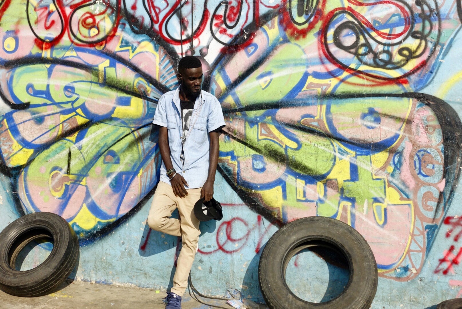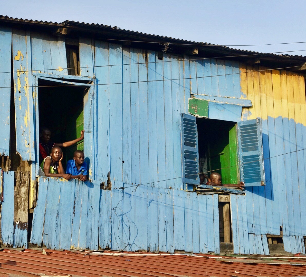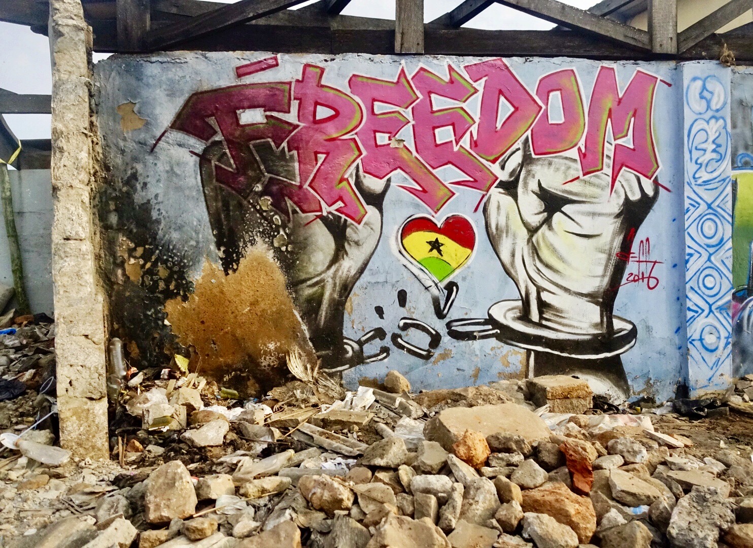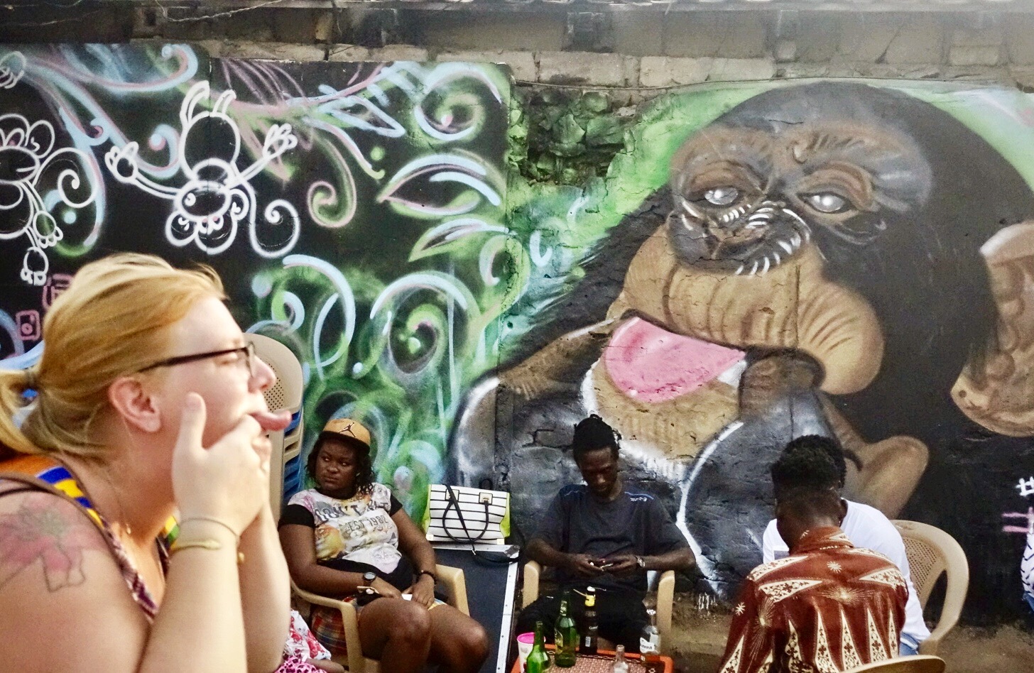 Dozens of buildings are in a state of being half built or half decayed along the road. Quick glances at the buildings provide flashes of color revealed through unfinished windows or crumbling holes, inviting a closer look. Once beyond the thresholds, it’s clear why the crowd is gathered there: the walls are covered in murals. Subject matter ranges from spins on the festival’s theme, Wata Mata, to playful images of chimpanzees. Artists from across Ghana and around the world have made the walls in this historic community their canvases and everyone is interested.