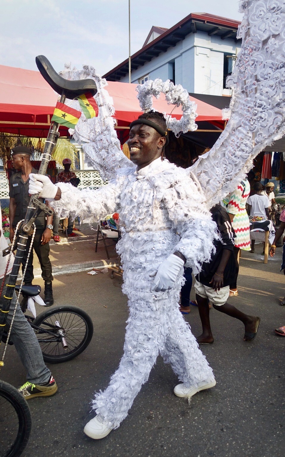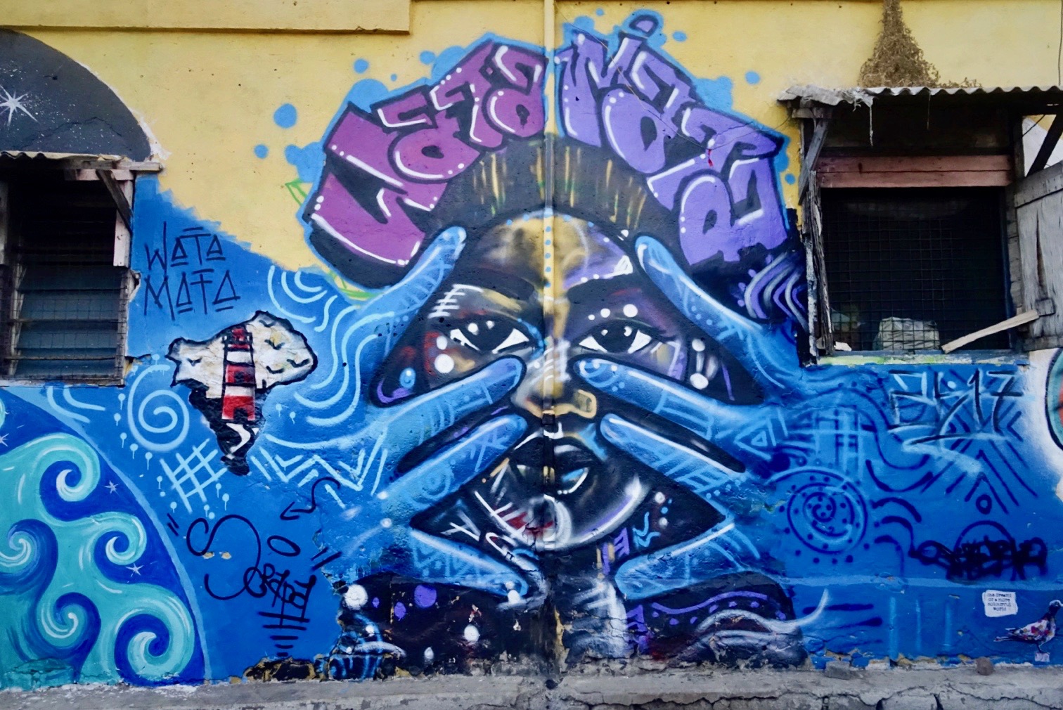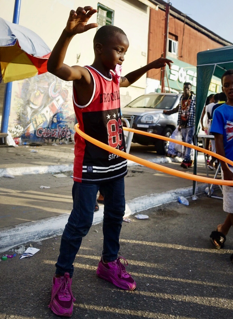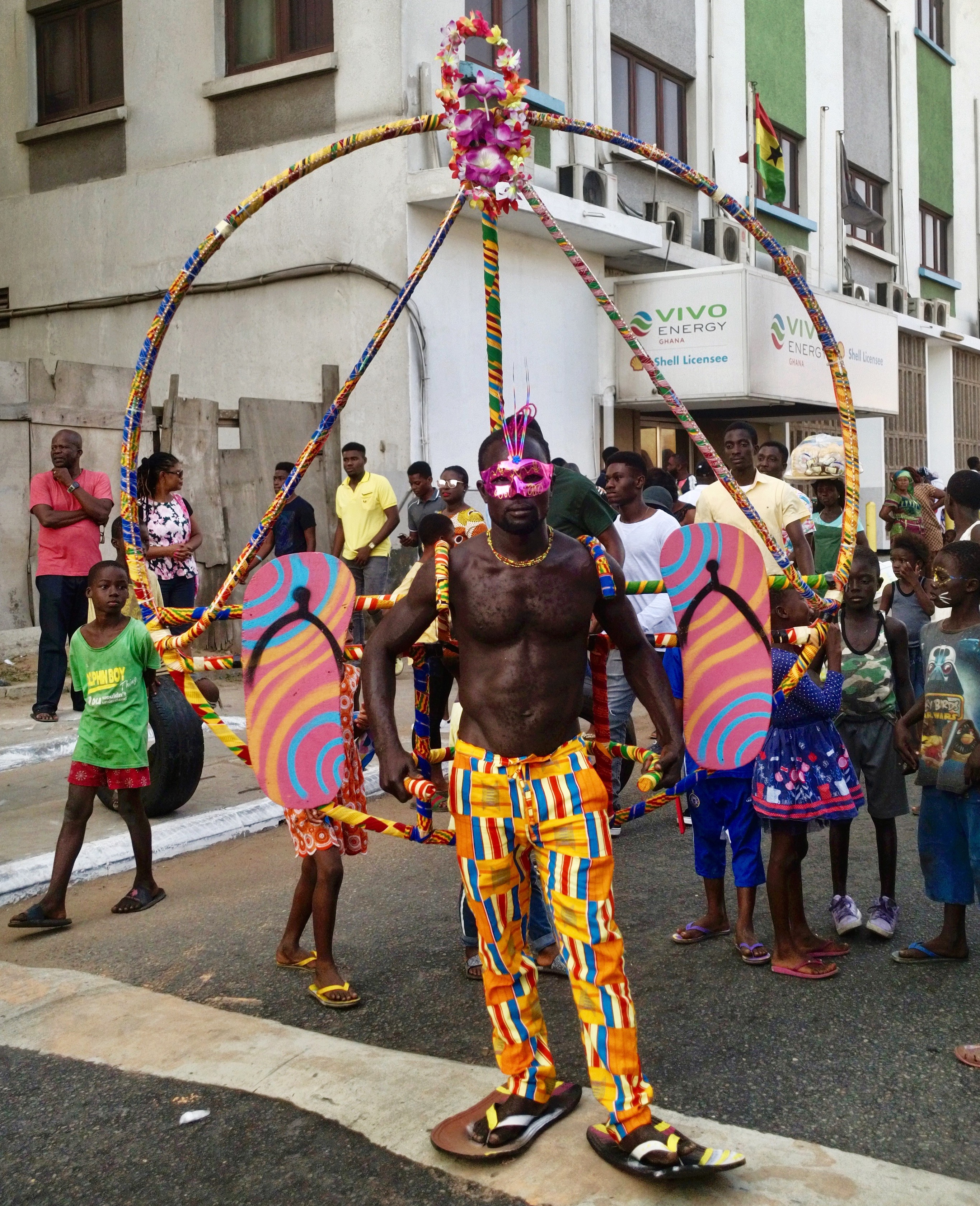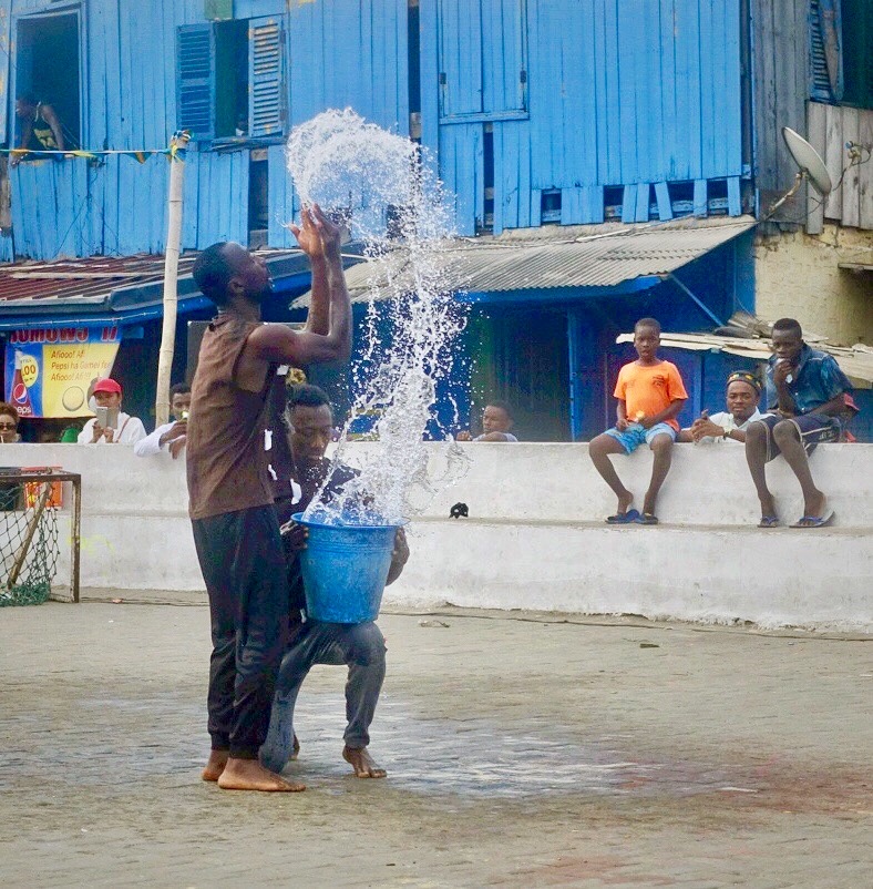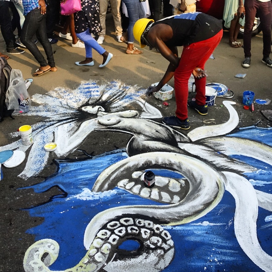 Chale Wote (cha-lay whoa-tay) roughly translates as, “Friend, let’s go!” It’s what Ghanaians call flip flops. But for a week each year, it refers to this street art festival. This year, 2017, was the festival’s seventh year and the theme, Wata Mata, wrapped up a trilogy of themes. Wata Mata is West African Pidgin for Water Matter. It’s described as “an endless space of form making” and an “all access dream machine.” The festival is described as “an alternative platform that brings art, music, dance and performance out into the streets.”